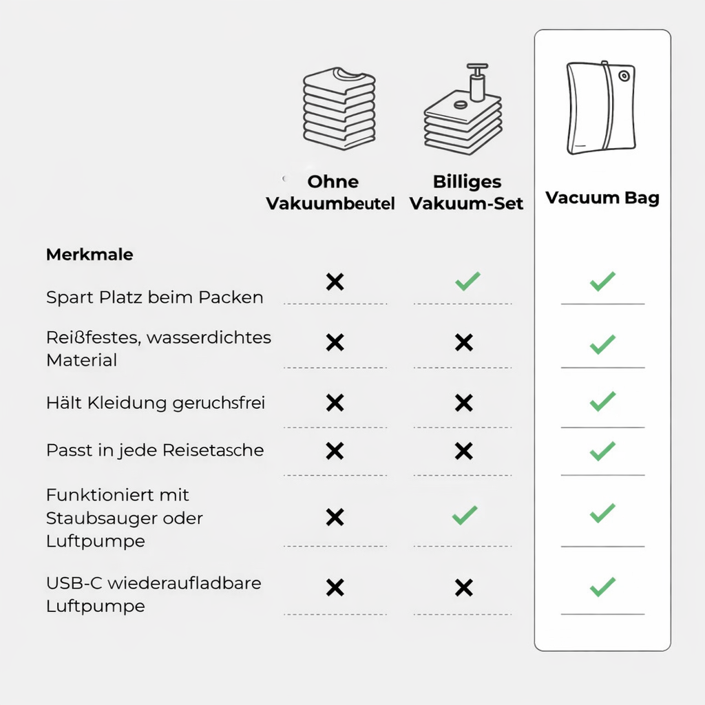 Unsere Reise-Vakuumbeutel wurden entwickelt, um genau diese Schwächen zu vermeiden.